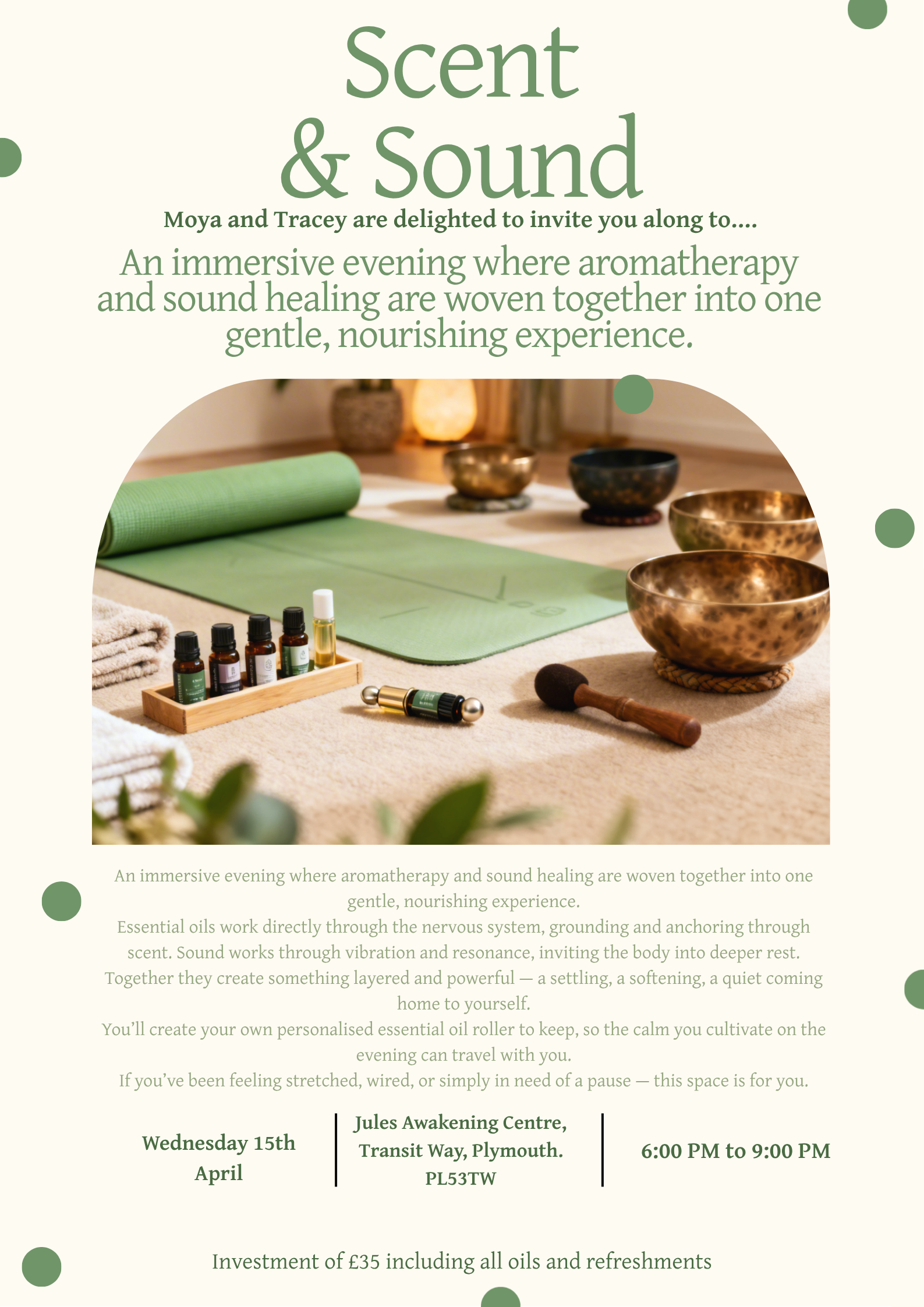 Intention setting, essence roller ball making, stirring oils into Epsom salts to take home and use for bathing or scrubs. A blissful soundbath to further deepen and connect to yourself and your chosen oils. A safe space to rest, realign and restore balance, mind, body and soul….